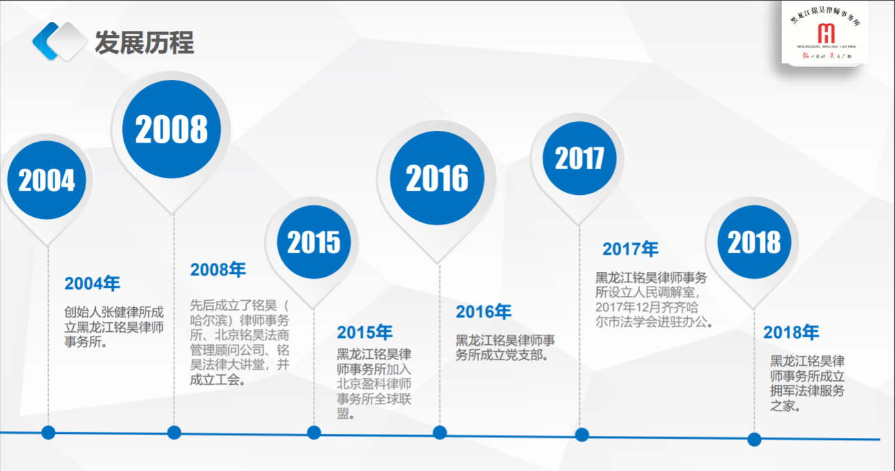 2004年创始人张健成立黑龙江铭昊律师事务所;